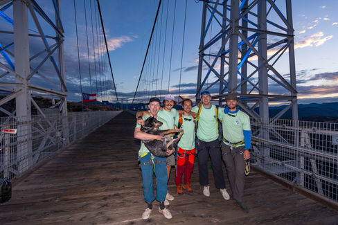 Highlining is a unique adventure sport that entails setting up a roughly 1-inch wide piece of webbing, spanned between two points of similar elevation, high above the ground. Anchors, pully systems and safety backups are essential when rigging a highline. Attached with a 5 foot leash to a climbing harness highliners walk, traverse and sometimes do tricks on the line.